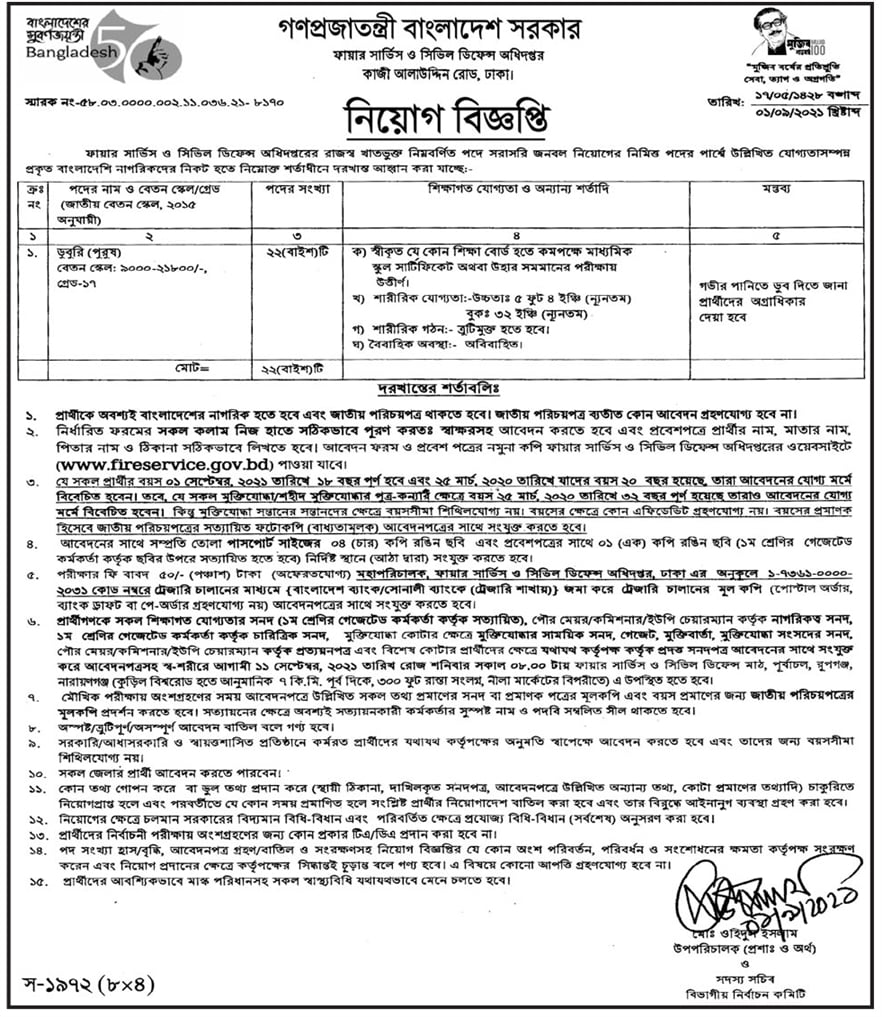 আগ্রহীরা মহাপরিচালক, ফায়ার সার্ভিস ও সিভিল ডিফেন্স অধিদফতর, ঢাকা বরাবর আবেদনপত্র দাখিল করতে হবে। আবেদনপত্র ফায়ার সার্ভিসের ওয়েব সাইটে পাওয়া যাবে।