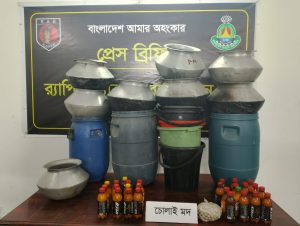 র্যাপিড এ্যাকশন ব্যাটালিয়ন (র্যাব) প্রতিষ্ঠাকালীন সময় থেকেই দেশের সার্বিক আইন শৃঙ্খলা পরিস্থিতি সমুন্নত রাখার লক্ষ্যে সব ধরণের অপরাধীকে আইনের আওতায় নিয়ে আসার ক্ষেত্রে অগ্রণী ভূমিকা পালন করে আসছে। র্যাব নিয়মিত জঙ্গী, অস্ত্র উদ্ধার, সন্ত্রাসী, সংঘবদ্ধ অপরাধী, অস্ত্রধারী অপরাধী, ভেজাল পণ্য, ছিনতাইকারী, ধর্ষণ, অপহরনসহ মাদকের বিরুদ্ধে অভিযান চালিয়ে আসছে। এরই ধারাবাহিকতায় সদর কোম্পানি, র্যাব-৫, রাজশাহীর একটি আভিযানিক দল অদ্য ইং ১৭ জানুয়ারী ২০২৪ তারিখ ১৭.৫০ ঘটিকায় ঘটনাস্থল রাজশাহী জেলার তানোর থানাধীন ২নং বাধার ইউপির ৭নং ওর্য়াডের অন্তর্গত বলাই টুডু (৫০), পিতা-মৃত মাঝি টুডু, সাং- ধামধুম (বাধাইড়), থানা-তানোর, জেলা-রাজশাহীর বসতবাড়ীর হইতে গ্রেফতারকৃত আসামী ১। জামিন হাসদার (৩৬), পিতা-কান্দন হাসদার ২। সাগর কিস্কু (৩৫), পিতা- বিষু কিস্কু, উভয় সাং-কালিকান্দর, থানা-তানোর, জেলা-রাজশাহী দ্বয়ের নিকট হইতে ০৫ লিটার বোতলে করে মোট ১০লিটার এবং পলাতক আসামী ৩। বলাই টুডু (৫০০), পিতা-মৃত মাঝি টুডু, সাং-ধামধুম, থানা-তানোর, জেলা-রাজশাহীর বসতবাড়ি হইতে ৬৩টি পাত্রে মোট-১৭৯২ লিটার চোলাইমদ সর্বমোট (১০+১৭৯২)=১৮০২ লিটার অবৈধ চোলাইমদ উদ্ধার করা হয়।