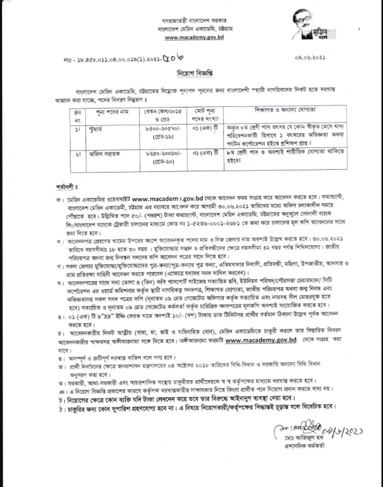 বাংলাদেশ মেরিন একাডেমি, চট্টগ্রাম সম্প্রতি নিয়োগ বিজ্ঞপ্তি দিয়েছে। প্রতিষ্ঠানটি একাধিক পদে লোকবল নিয়োগ দেবে। আগ্রহীরা অনলাইনে আবেদন করতে পারবেন।